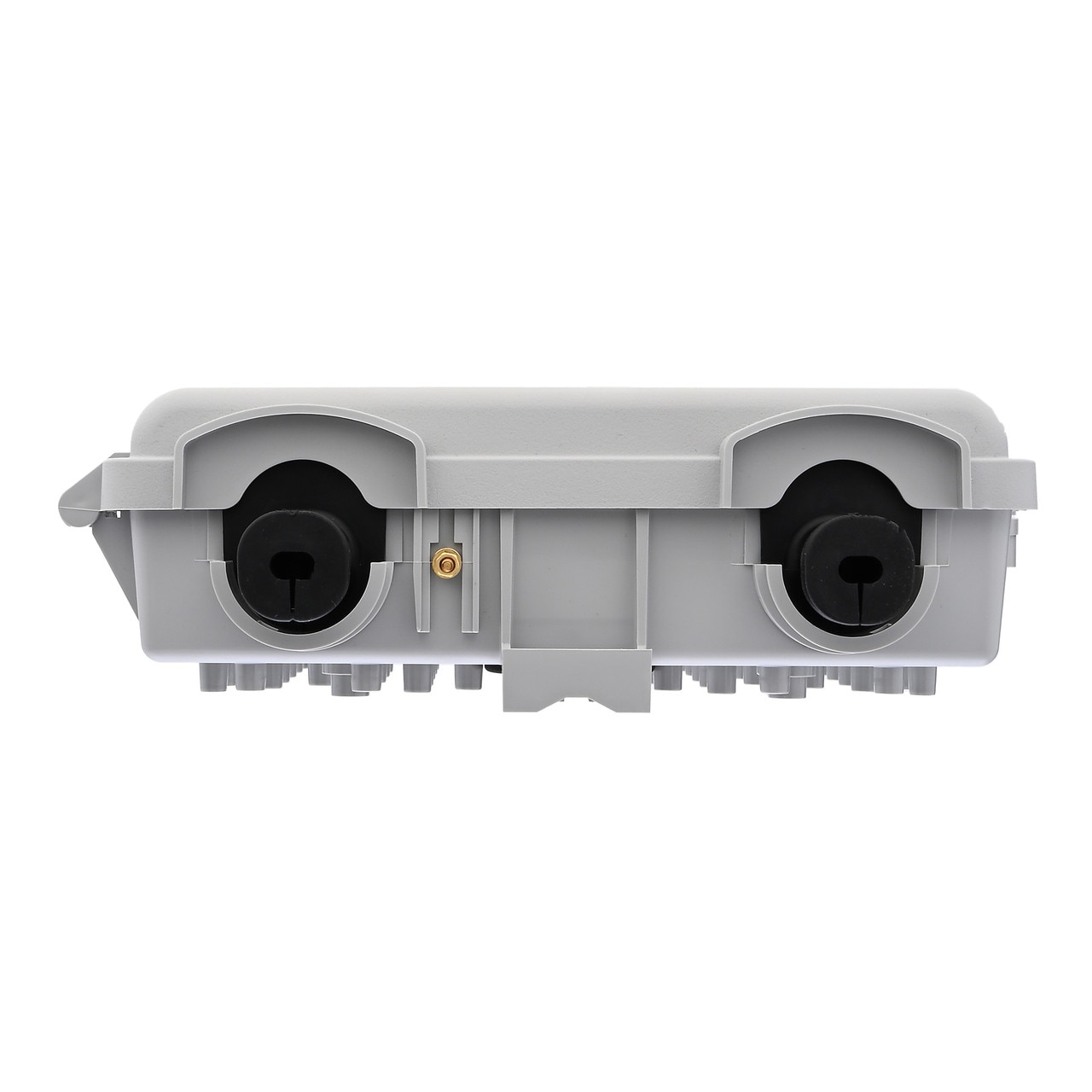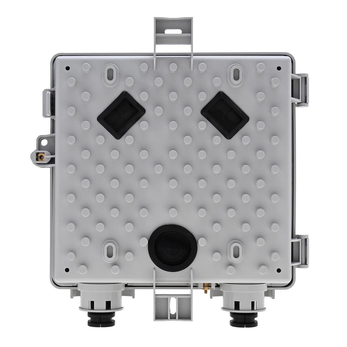 TheNID Indoor/Outdoor Wall Mount Fiber Patch Panel, gray plastic, 10.28H x 9.93W inches, 1 simplex SC APC installed and duplex SC APC in bag, can splice up to 2 single fibers or 1 mass fusion, 1 internal cable manager, can clamp on round or flat cable, ground lug pre installed, includes QTY 2 flat and flexible strain relief entry grommets, rubber gasket, can handle up to 1 inch conduit.