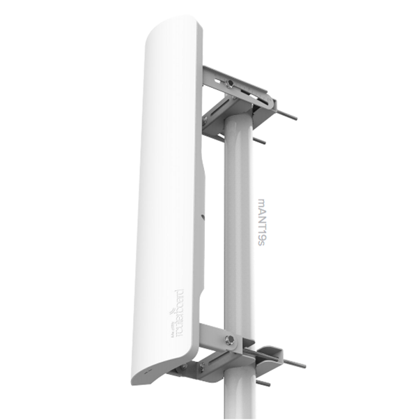 ISP Supplies supplies the MikroTik mANT 19S dual polarized 5GHz 19dBi 120 degree beamwidth antenna with (2) RP-SMA conntectors. It comes with metallic U bolt type mounts. The new sector mANT antennas are the perfect companion for the BaseBox, NetBox, NetMetal or any other outdoor wireless device.