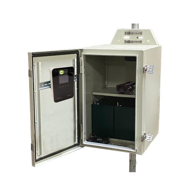 Features include 12VDC/24VDC configurable output, an advanced 60A MPPT battery charge controller to protect against over-charging or over-discharging of the valve regulated sealed lead acid AGM batteries. The pole/wall mount aluminum enclosure has multiple ports for CAT5 cable, antenna cables/connectors or other cabling. They have thermostatically controlled power ventilation which turns on automatically when inside temperature exceeds 45C.