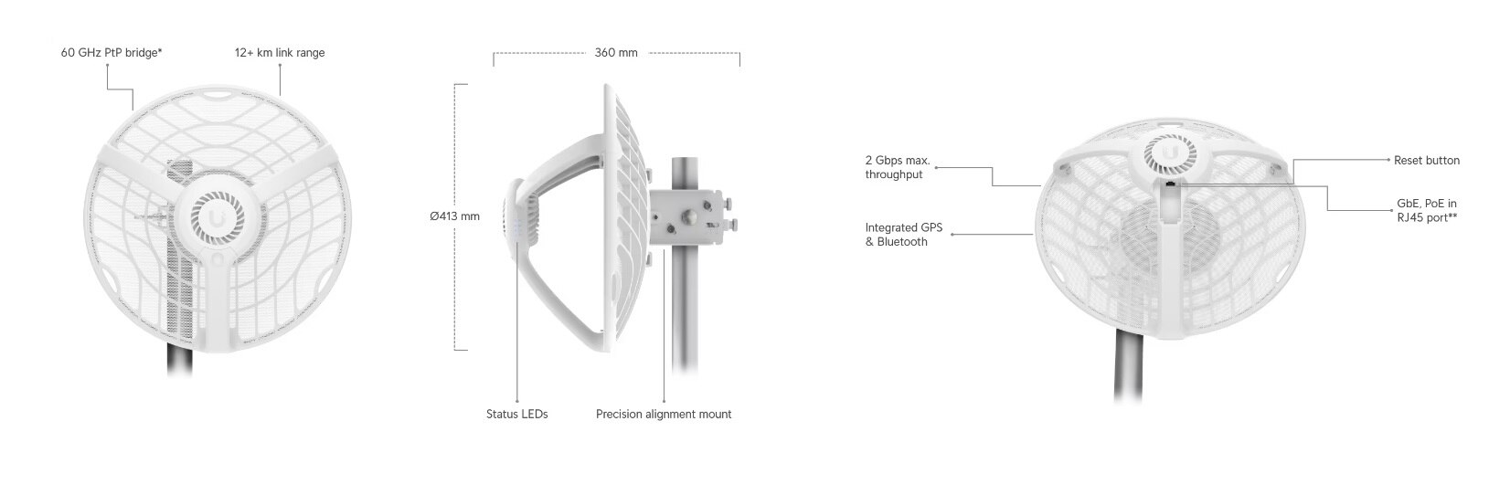 airFiber 60 GHz Radio System Featuring Wave Technology with True Duplex Gigabit Performance for PtP Links over 12 km Distances.
