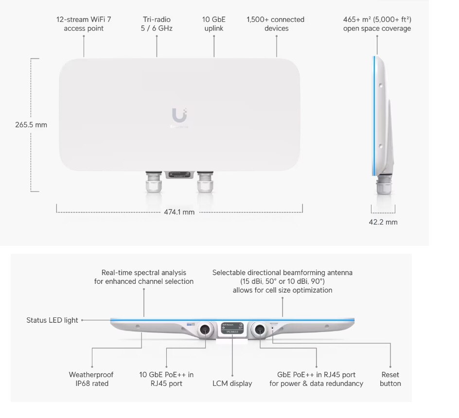 Enterprise-grade, indoor/outdoor access point designed for high-density environments with 12-stream 5 GHz and 6 GHz WiFi 7 performance, a 10 GbE uplink, and a redundant GbE port for high availability.