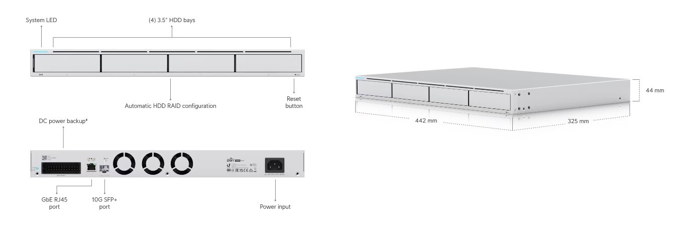 The UniFi® NVR is an enterprise network video recorder that integrates an NVR, the UniFi Protect software, and a 4-drive bay. UNVR unifies enterprise-class data protection and scalable storage with simple Plug and Play integration using the intuitive UniFi Protect software. From a desktop computer or mobile device, you can access your surveillance recordings from virtually anywhere using the intuitive graphical user interface. The mobile app is available for iOS and Android-based devices. The drive bays are easily accessed from the front panel, so hard drive mounting and maintenance are simple. Using four 8 TB drives in a RAID 5 configuration, the UNVR can provide up to 30 days of 4k video storage for 15 cameras or Full HD video storage for 50 cameras.