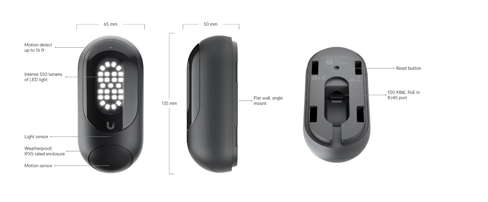 This UniFi Protect Smart Flood Light from Ubiquiti Networks is a floodlight that features integrated motion detection and a light sensor. The unit detects moving objects up to 16' away. Remote management and configuration are possible thanks to the UniFi Protect app for iOS and Android. This device is housed in an IPX5-rated enclosure for protection from water.