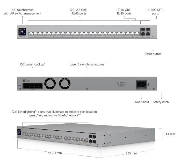 Professional-grade, Layer 3 Etherlighting™ switch with (2) 10 GbE, (22) 2.5 GbE, and (4) 10G SFP+ ports.
