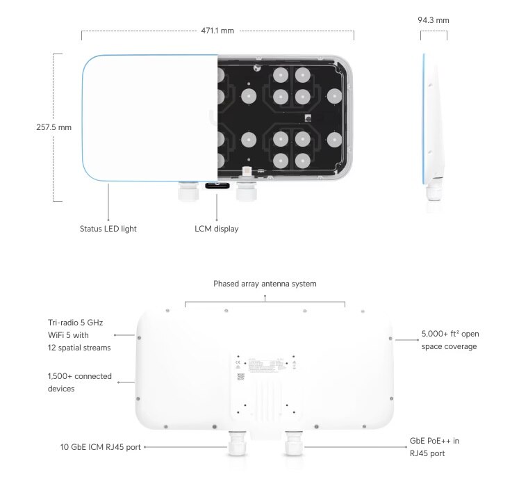 The UniFi WiFi BaseStation XG delivers unprecedented wireless awareness and security, including tools for real-time spectrum monitoring, airtime utilization analytics, and intrusion detection/prevention.